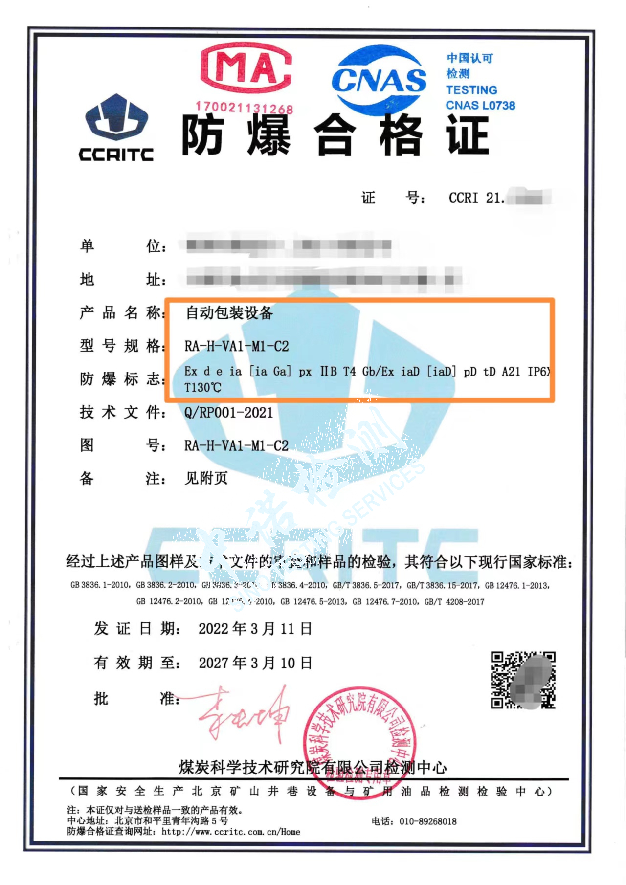 中諾檢測成功辦理的自動包裝設(shè)備的防爆標(biāo)志是: